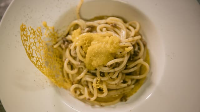 Mozzarella, crema di pecorino romano, guanciale e cipolline croccanti arrosto