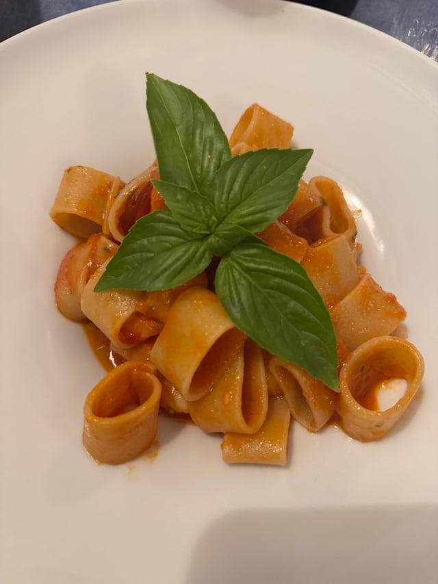 Mozzarella fior di latte, salsa di datterini, basilico, grana grattugiato, olio Evo