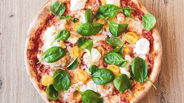 Salsa di pomodoro da polpa italiana, mozzarella fior di latte, stracciatella pugliese, code di gambero, pomodorini al chinacin freschi