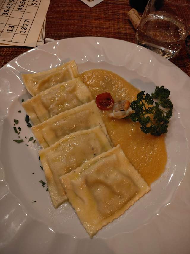 - Ravioli al nero di seppia con spigola su vellutata di gamberi