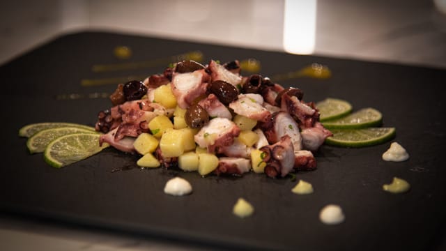 Polpo, seppia, gamberi, patate e olive taggiasche con citronette di olio e limone