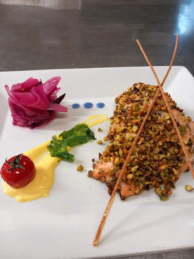 - Salmone in crosta di pistacchio con cipolla caramellata