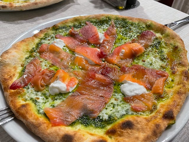 Fior di latte, salmone, pesto di rucola, stracciatella