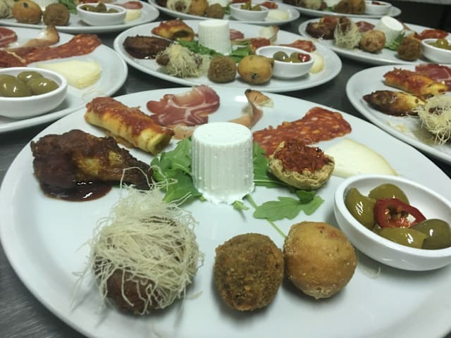 - Salame. capocollo, formaggio, ricotta, polpettina di carne, olive, frittellina, cipolla in agrodolce, insalata di mare, alici marinate, degustazione di legumi e verdure.