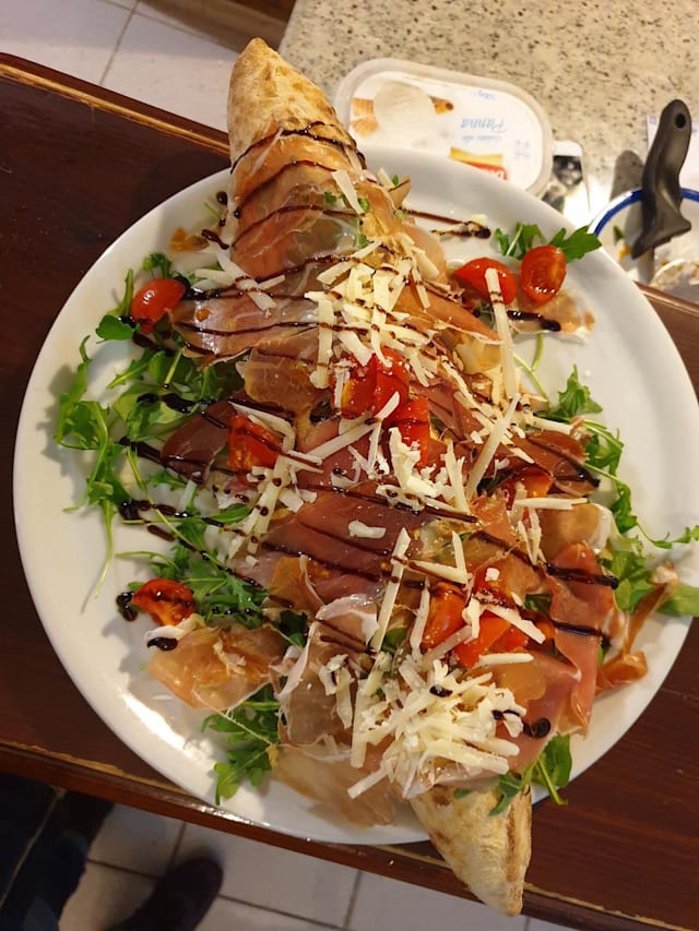 - (tronchetto base pizza ripieno di formaggio emmenthal, gorgonzola, mozzarella, grana, su letto di rucola, avvolto da prosciutto crudo, pomodorino ciliegino, scaglie di grana, glassa aceto balsamico)