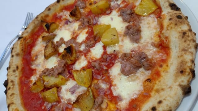 Fior di latte, crema al tartufo, patate, salsiccia e asparagi