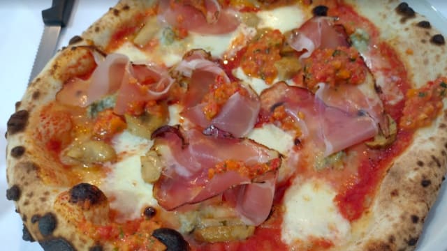 Fior di latte, gorgonzola, salame piccante, cipolla di tropea, olive taggiasche e uovo sodo