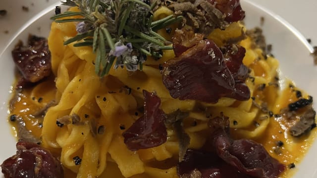 Tagliolino con crema di zucca gialla, crumble d’anatra affumicato e tartufo