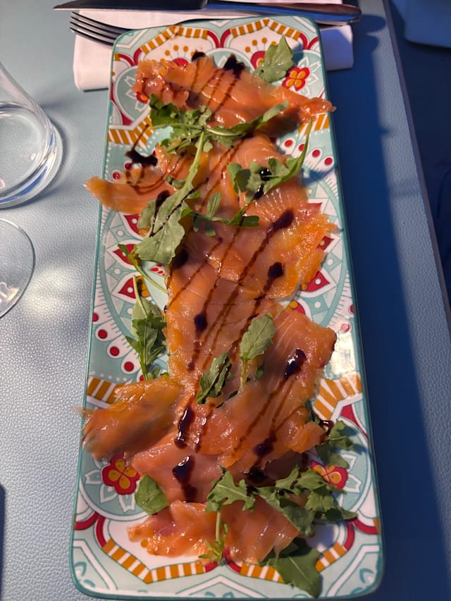 Insalata di seppie con verdure sott'aceto-carpaccio di salmone e rucola-insalata di polpo e patate- mazzancolle al vapore-pesce spada marinato all'arancia