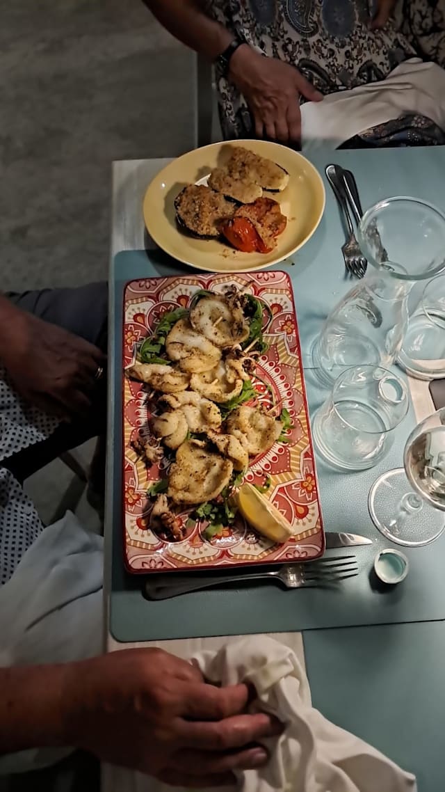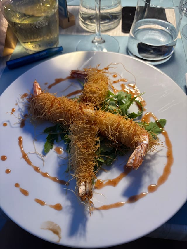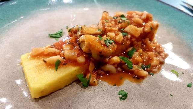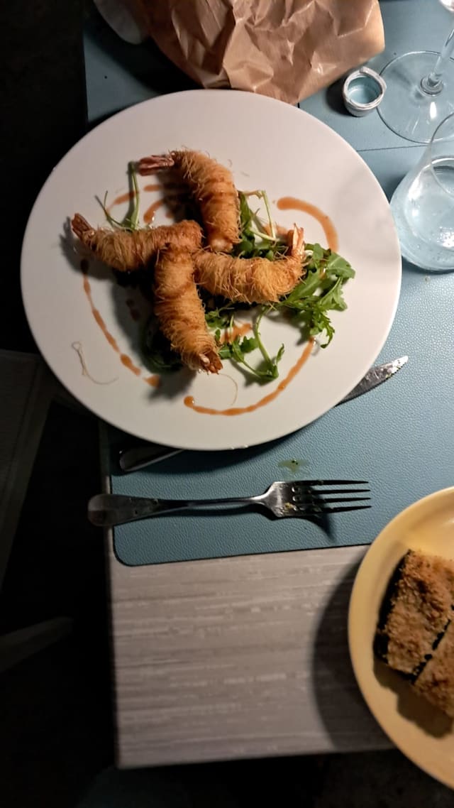 Coda di rospo in porchetta con cicoria saltata in padella-gamberi in pasta kataifi con salsa di lamponi-hamburger con tonno scottato-cozze in guazzetto.In genere l'antipasto caldo comprende 3 di questi antipasti e nei vari periodi cambiano. Per informazioni chiedere al cameriere. Grazie