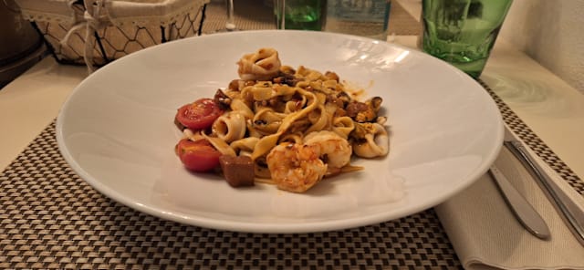 Tagliolini fatti da noi, gamberi rosa, la sua bisque e funghi