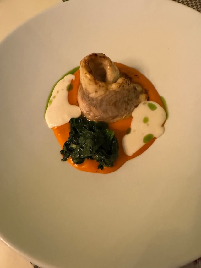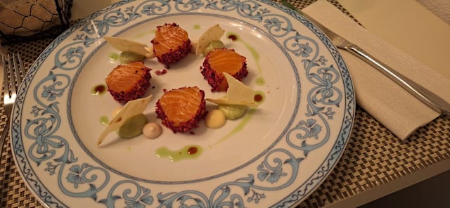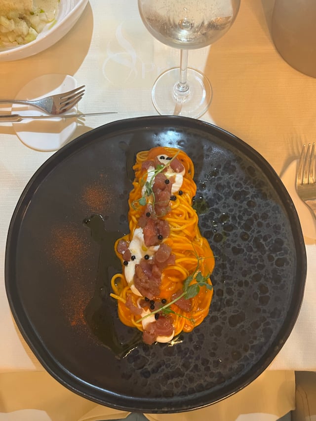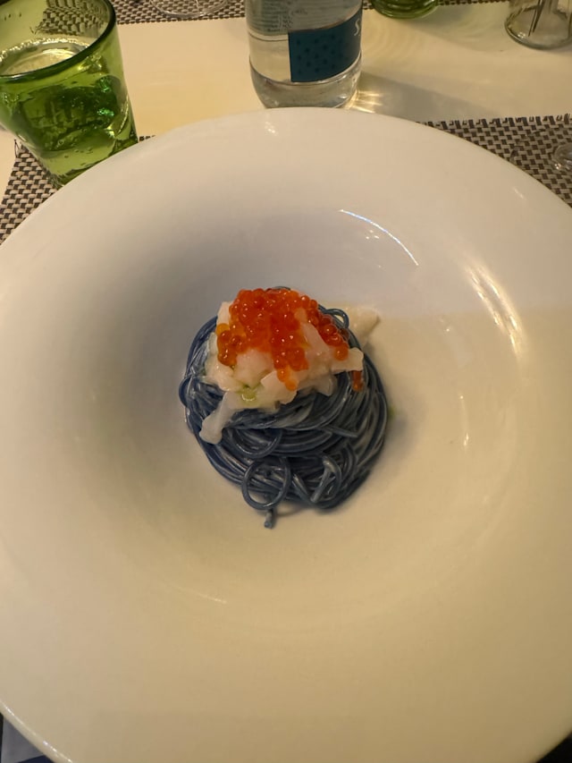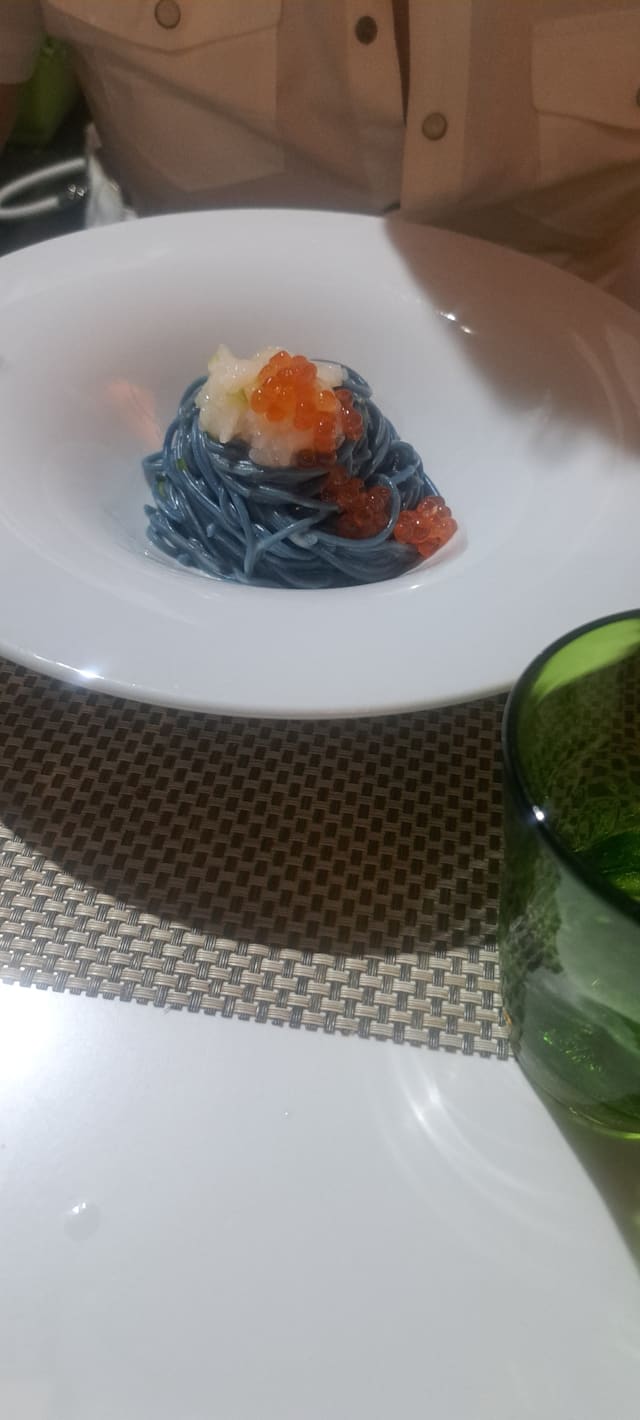 Spaghetti di spirulina, del pastificio rustichella d’abruzzo, con tartar di capesanta, caviale di salmone su crema al limone di spotorno