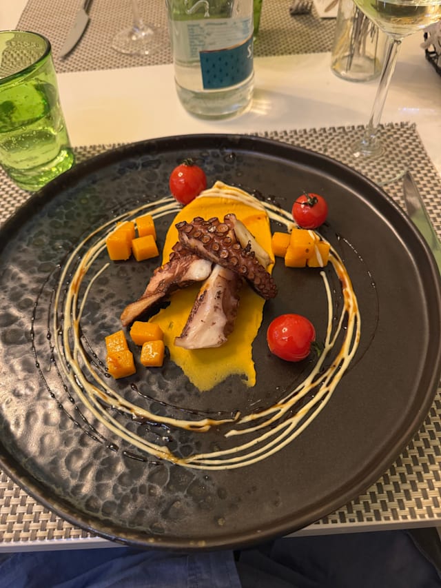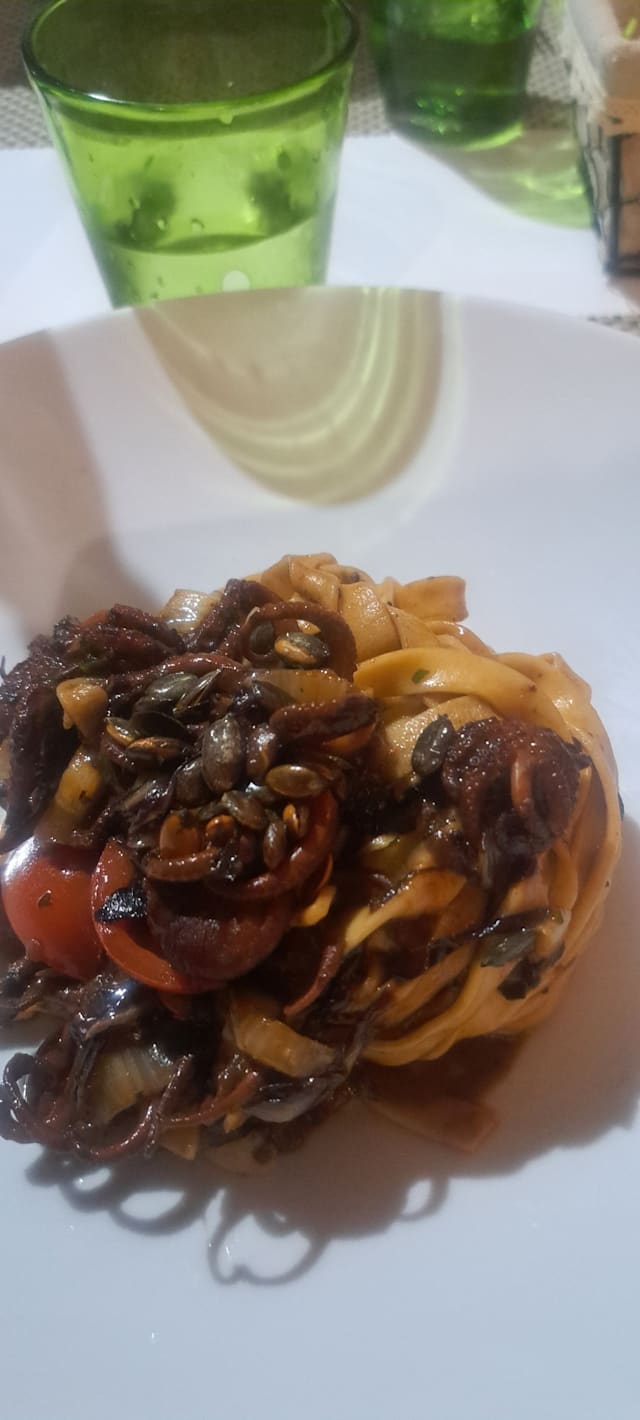 Tortelloni fatti da noi, ripieni di polpo, carciofi di albenga e pomodorini confit