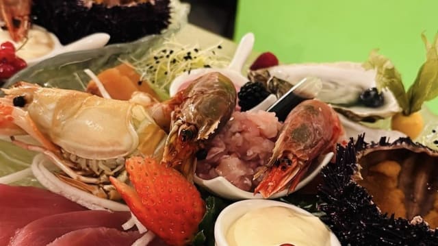 (tonno”, salmone”, capesanta”, gambero rosso”, gambero viola”’, scampo”, tartar del pescato del giorno “ e ostrica)