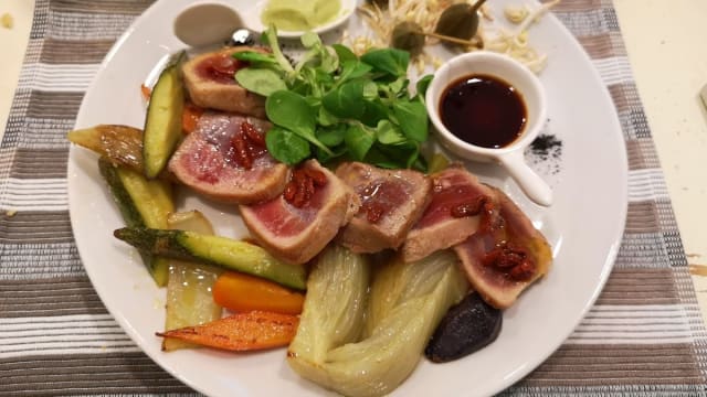 Tataki di tonno, coulisse di pomodoro, maionese di cavolfiore, gocce di basilico e vinaigrette di ponzu