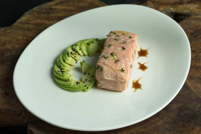 - Fette di pesce spada affumicato servite con burrata cremosa e una glassa aromatica