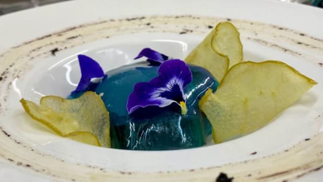 Polipo con avocado, cocco, riduzione di lamponi e cialda di pomodoro alla vaniglia