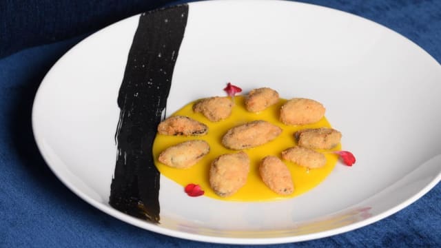 Paleta di patanegra con fiore di zucca ripieno di mozzarella di bufala in tempura