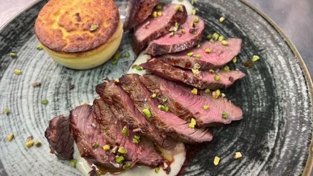 Petto di anatra, flan di spinaci, ketchup all'albicocca e robiola
