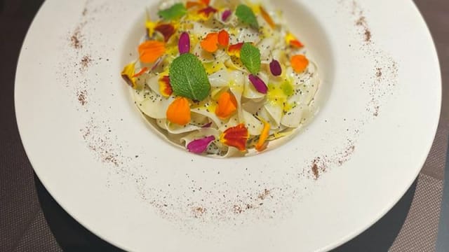 Impasto al nero di seppia, burrata, tartare di tonno, maionese alla paprika e zest di lime