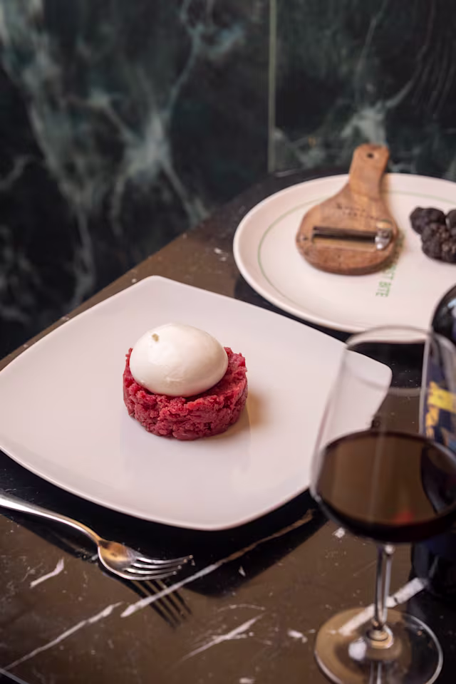 - Tartare di chianina con burrata e scaglie di tartufo fresco