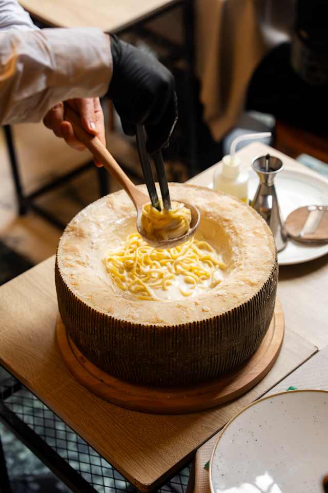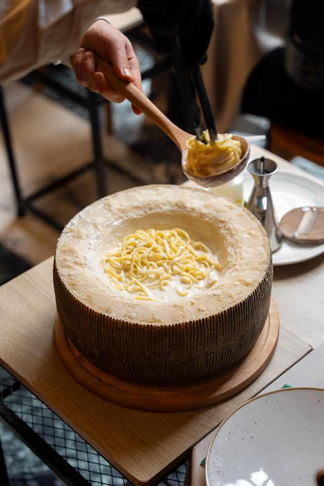 - Tagliolini mantecati in forma di grana padano con scaglie di tartufo fresco (per 2 persone)