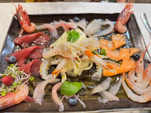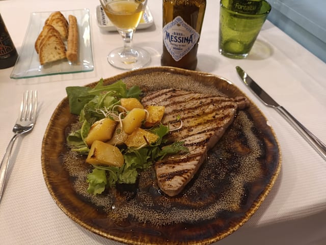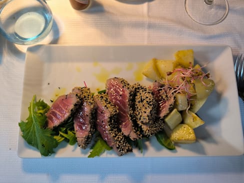 9.5/10exceptional Sicilian seafood: pistachio coated tuna steaks, melanzana parmigiana, & a very fresh salad with cherry tomatoes, fennel, basil, .. delizicioso!