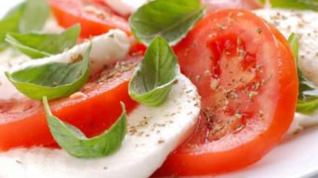 Pizza con pomodoro, mozzarella, melenzane, basilico
