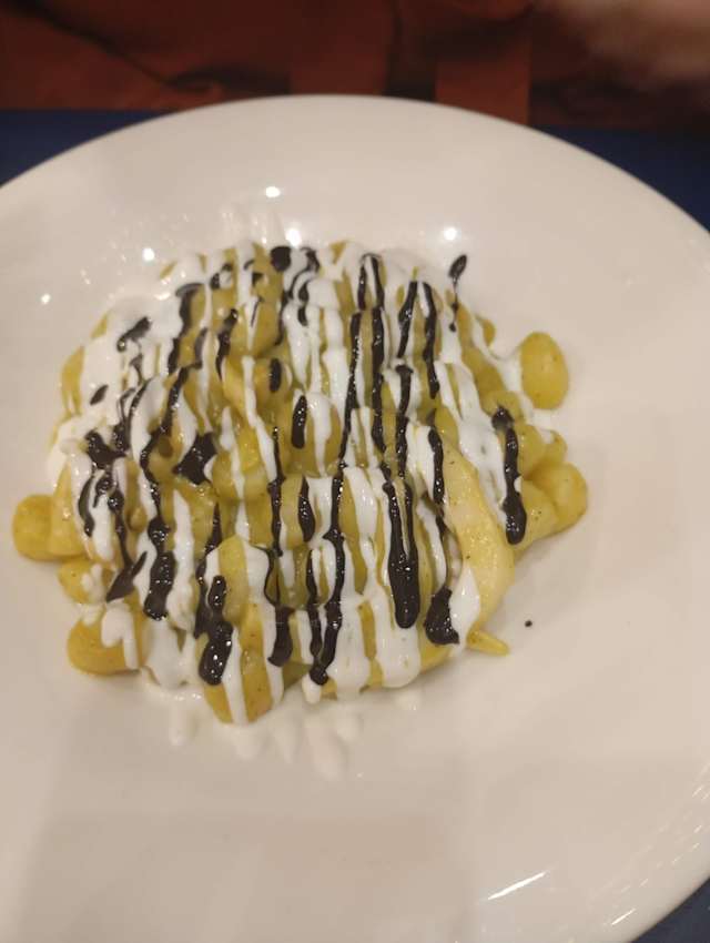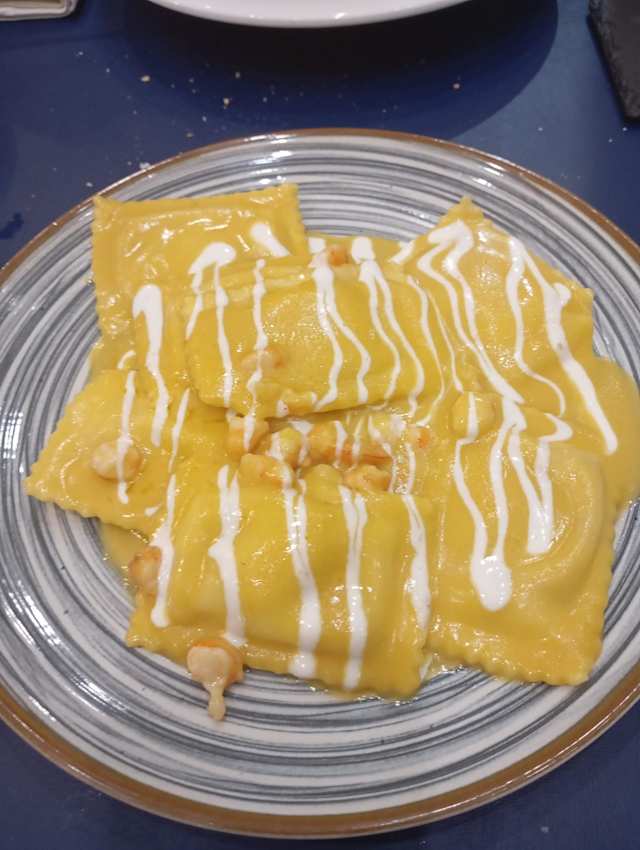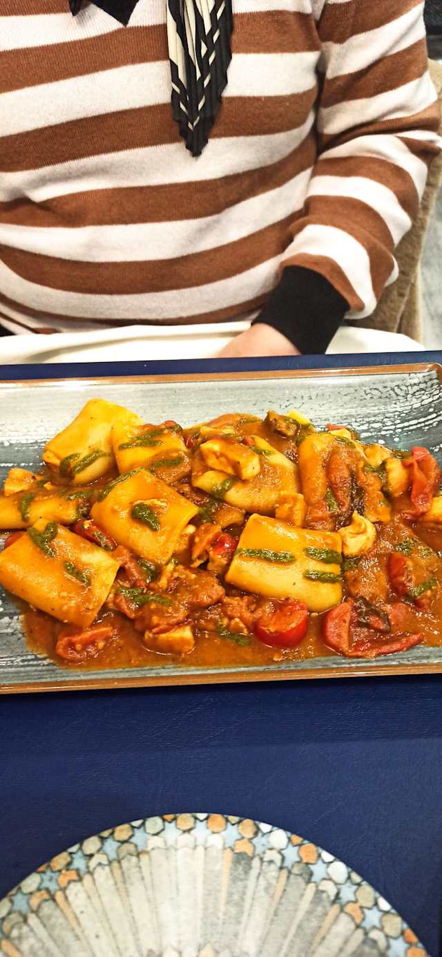 Gnocchetti con seppioline, calamaretti e zucchine in doppia consistenza, cremoso di bufala e riduzione al nero di seppa