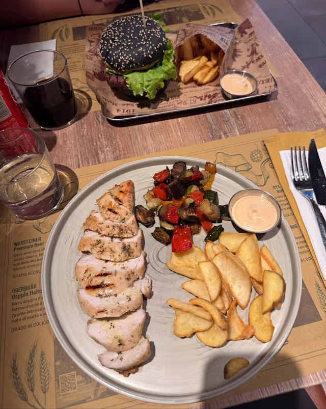 - Servito con patate dipper. Pane ai cerali, 2000g carne Angus, 'nduja, spianata piccante, peperoni, rucola, salsa allo zola