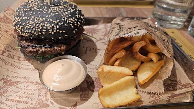 - Servito con patate dipper. Pane al carbone, 200g carne di bufalo, provola affumicata, rucola, capocollo, maionese al tabasco