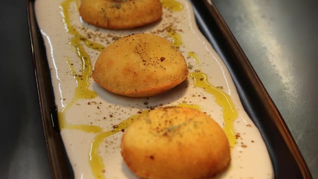 Fiore di zucca in pastella, suppli all’amatriciana, suppli classico, suppli cacio e pepe, mozzarella in carrozza, frittella di baccalà* e zucchine