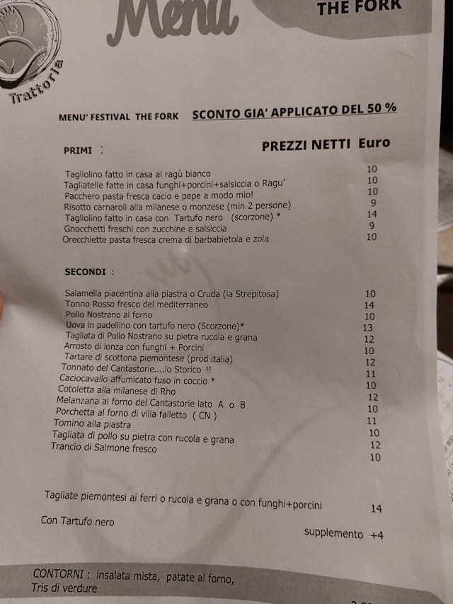 5/10Horrible menu.. Staff didn’t speak a word of English.. No discount as promised.. Charged more than I should’ve been and the bill was nonexistent, we were only given the final price.. Food was okay.. Not the best like you would expect it to be in Italy but not the worst I have had (no appetizers though).