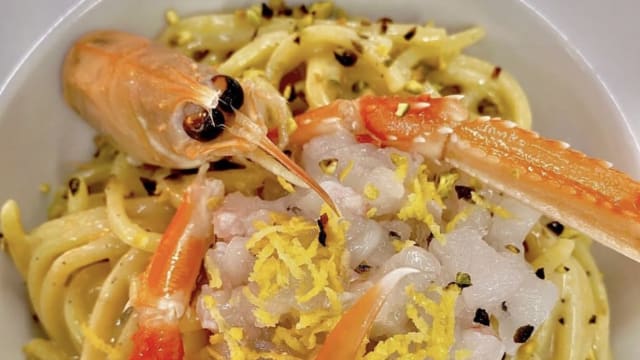 Troccolo con tartare di gambero viola, zafferano e stracciatella