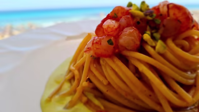 - penne,pesce spada*,pomodoro datterino,salsa di pomodoro,melanzane fritte panate con semola rimacinata,cipolla,menta,basilico,olio evo,aglio,sale,pepe nero