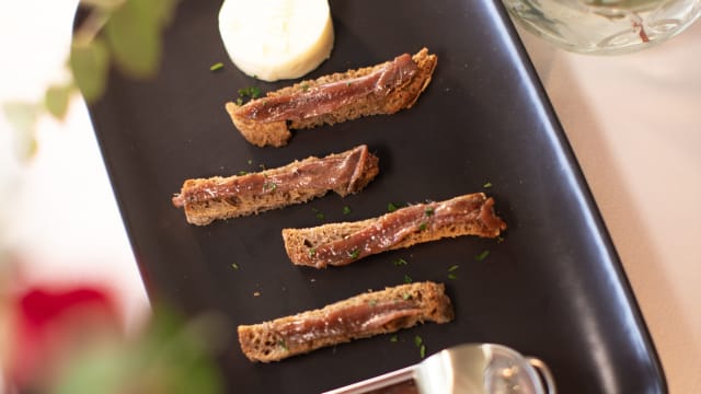 Burro di Normandia, alici del Cantabrico e crostini di pane nero