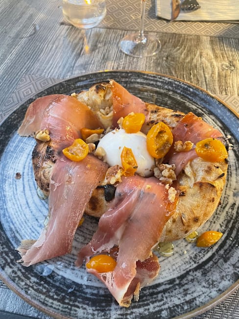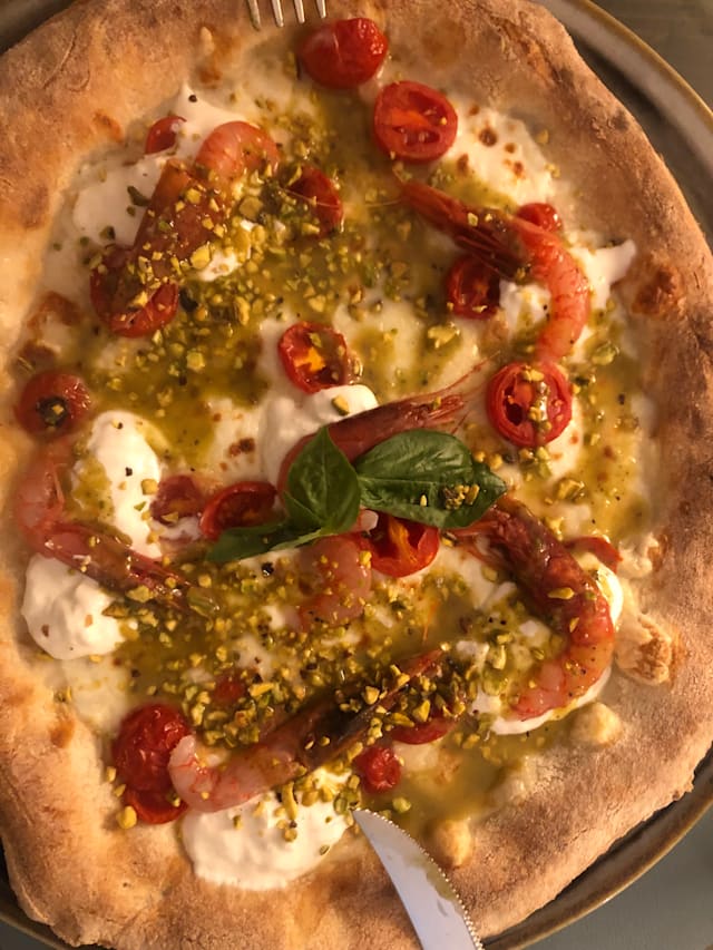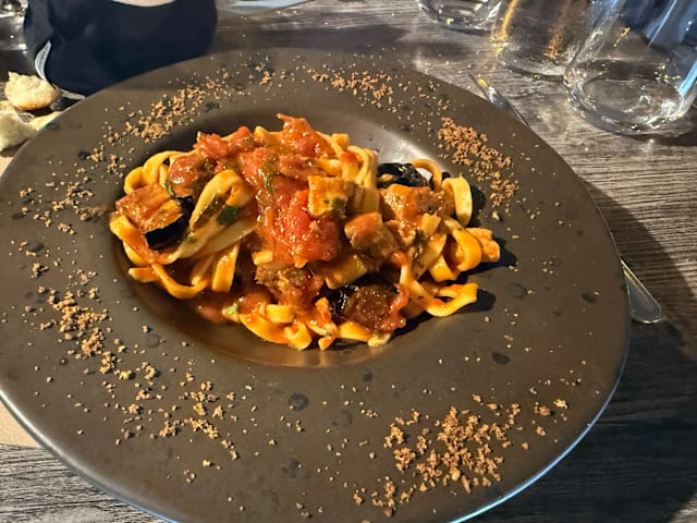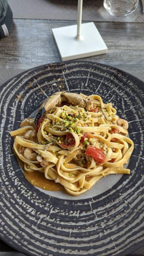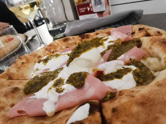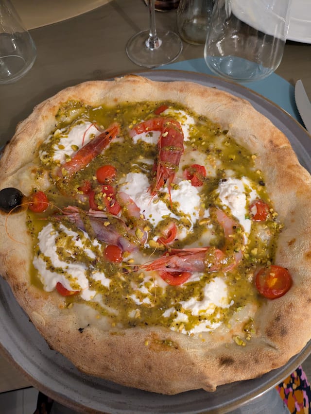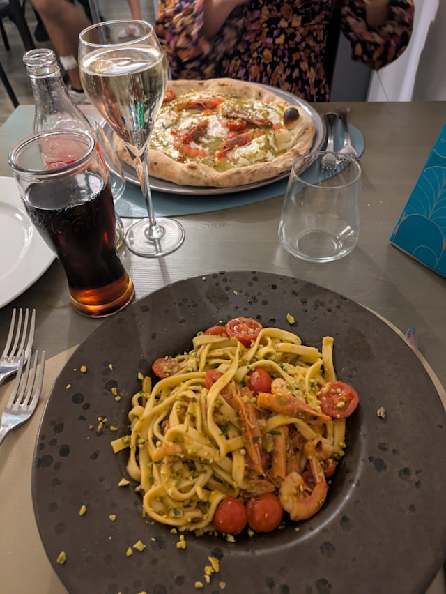 10/10Lovely local place with great Pizza. One issue if eating outside is that it's quite close to a main road. You actually get used to it pretty quickly, but some people might not like rhe noise. The crab pasta we had as a starter was excellent - not a lot of crab, but some prawns, some very tasty sauce and perfectly cooked pasta. The aubergine starter was excellent, actually we've had this dish several times in different places and it's always very good -local ingredients i guess :) My catch of the day was nice soft fish, well grilled. Best value is the pizza, my wife had one of the vip pizzas with ham mozzarella and pistachios, it was huge, very tasty and the crust seemed to have a filling, very nice indeed. I only had one glass of wine, feudo arancio grillo - pretty good, worth a try. Thanks for a lovely meal
