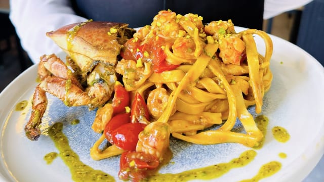 Crema di pistacchio, bufala campana dop, pomodorini gialli, prosciutto cotto artigianale, rucola e burrata
