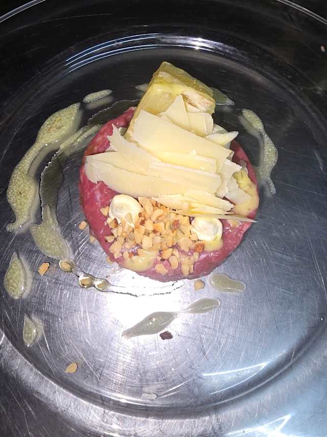 - Battuta di fassona piemontese con nocciole e scaglie di grana