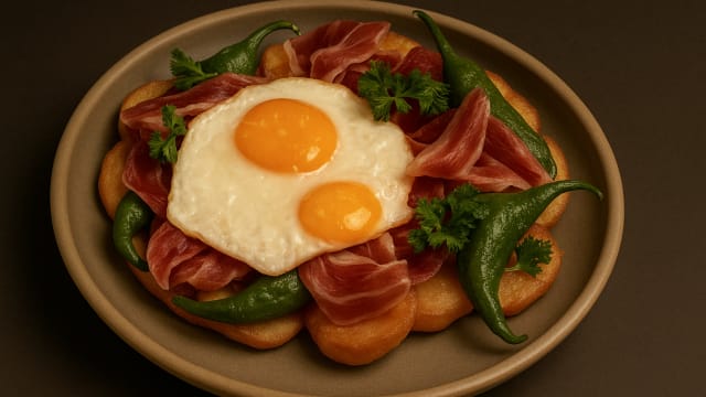 With potatoes, serrano ham, padrón pepper, parsley and truffle oil