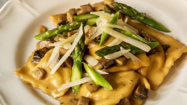 Ravioli ripieni di coda alla vaccinara, burro e terra di olive taggiasche