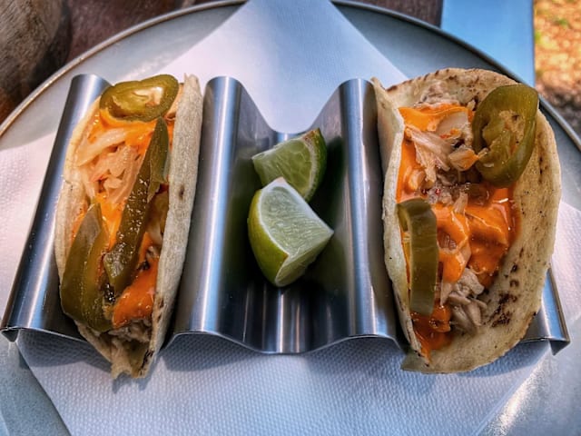 Affumicato con legno di quercia e rub di trebbie di birra, maionese aglio maionese agrumi, jalapeño e cipolla in agrodolce