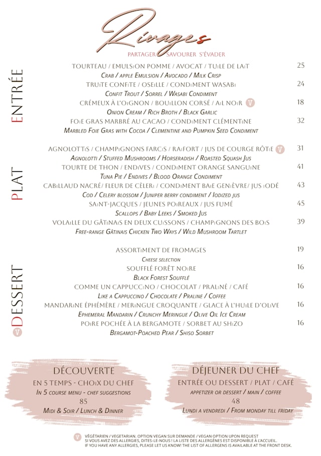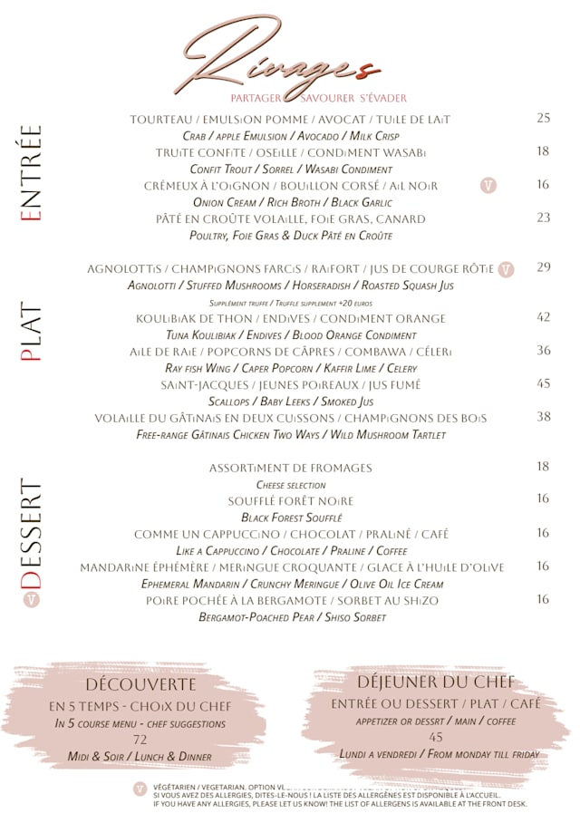 Bonjour Madame, Here’s a warm and appreciative response you could use: We are glad to hear you had such a wonderful experience at Rivages! The chef’s tasting menu really is a perfect way to enjoy a variety of delicious dishes, especially in such a lovely and bright setting. Thanks for sharing your beautiful experience- it means a lot! We would be delighted to welcome you again, why not come and taste our delicious pastries from our talented chef Louise Riot! Best regards, Justine Courtinier Guest Relation F&B
