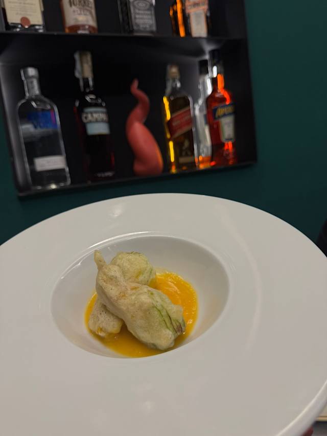 - Fiori di zucca ricotta di bufala,acciughe ,olive nere e crema fredda di zucchine