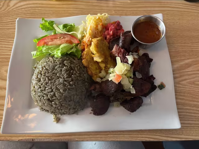 - Tasso de bœuf, acras, frite de manioc, bananes pesées, pikliz