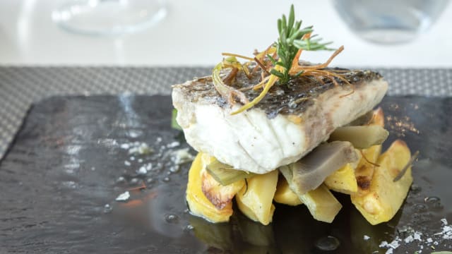 Dentice porchettato con gel al limone, crema di patate e chips violette