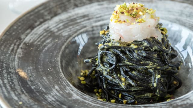 Tonnarelli al nero con pesto di pistacchi e battuto di gamberi rosa