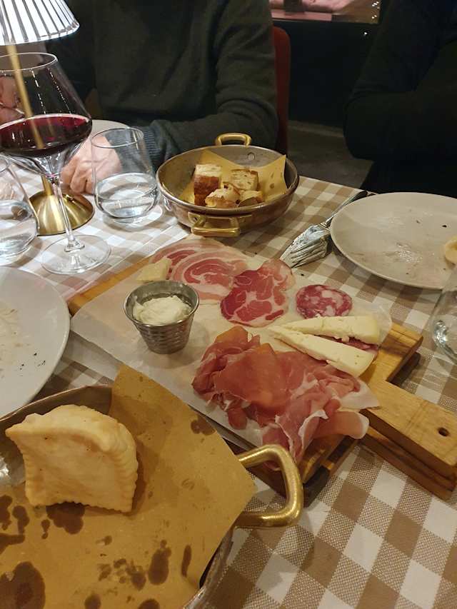 - Mortadella “palmieri”, salame felino, prosciutto di parma 30 mesi, pancetta arrotolata, coppa di parma, squacquerone, parmigiano reggiano 24 mesi DOP, caciotta bolognese dei colli