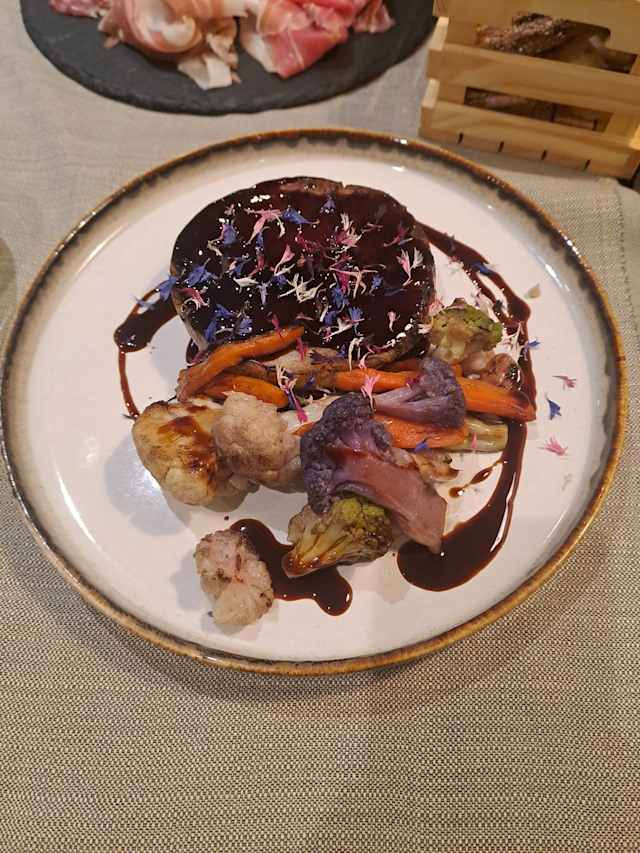 - Rollata di coniglio e borragine servita tiepida, con rucola e salsa di carote viola e zenzero