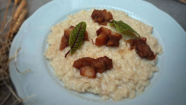 Risotto al tradizionale bleu di capra arricchito con pesche marinate alla liquirizia